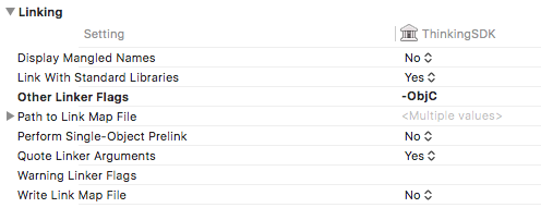 ThinkingSDK.framework,ThinkingDataCore.xcframeworkinto the Xcode project workspace project - In Xcode, go to Targets > Build Settings, add line
