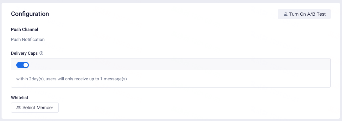 Configuration: You can choose whether to turn on A/B Test, Delivery Caps, and select the whitelist for operation tasks.