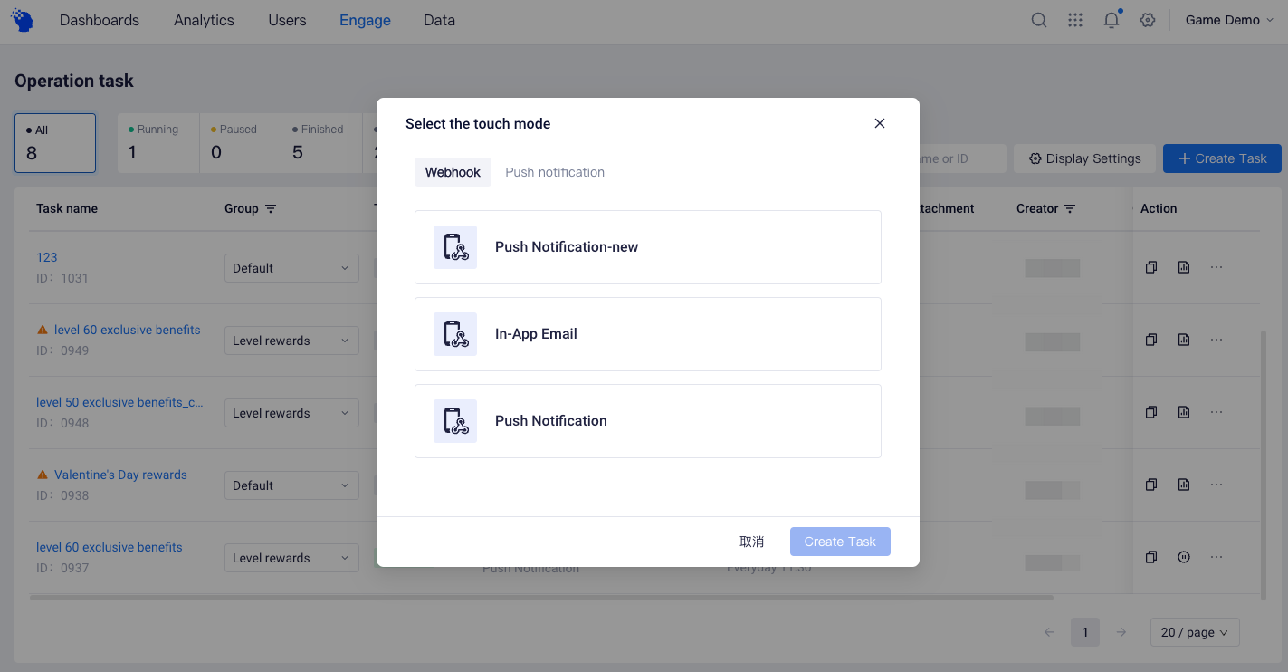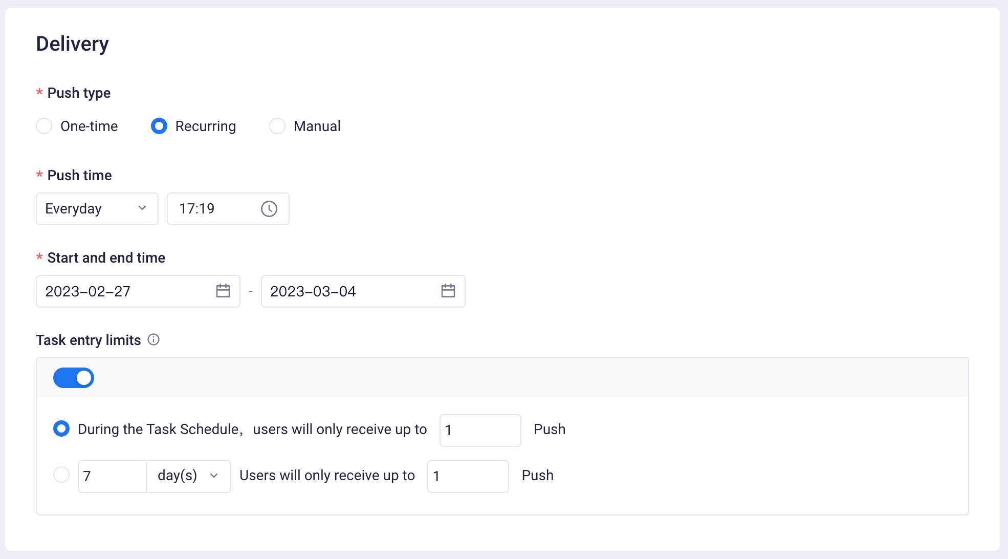 - Supports setting task frequency control to reduce ineffective reach (Frequency control: Limitations on maximum push times to each user within a period of time under the task)