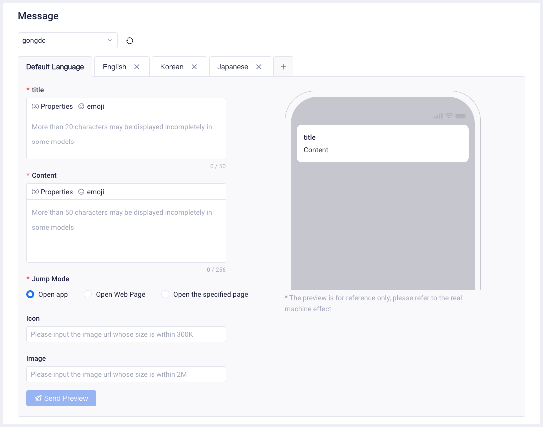 If your product is globally released, we support you to configure multiple language versions for push content. The corresponding language version will be matched based on the user's language property during the push. (If you need to use the multilingual feature, you need to configure the user's language property in the Localization settings .)