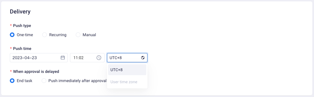 Supports multiple types of pushing timing. You may select One-time, Recurring or manual mode. In the meantime, you may also conduct more settings based on different Delivery types, such as approval timeout and frequency control.