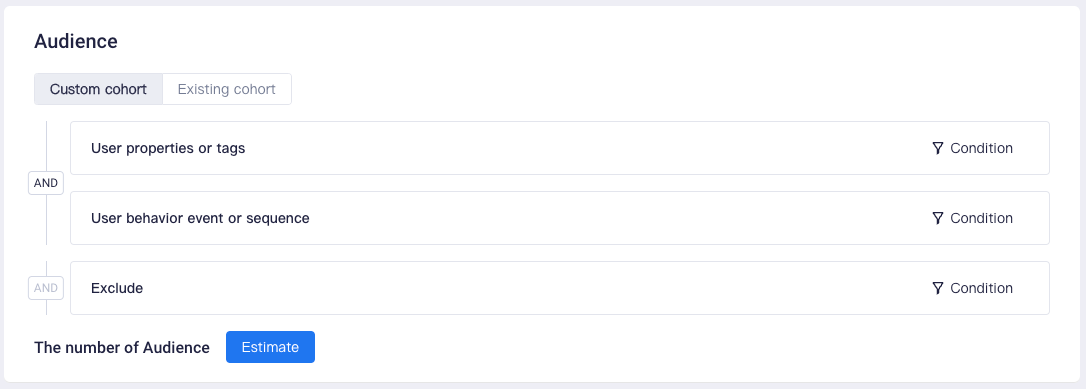 Audience: Select custom cohort (user property/tag/behavior events and excluded cohorts) or existing cohort