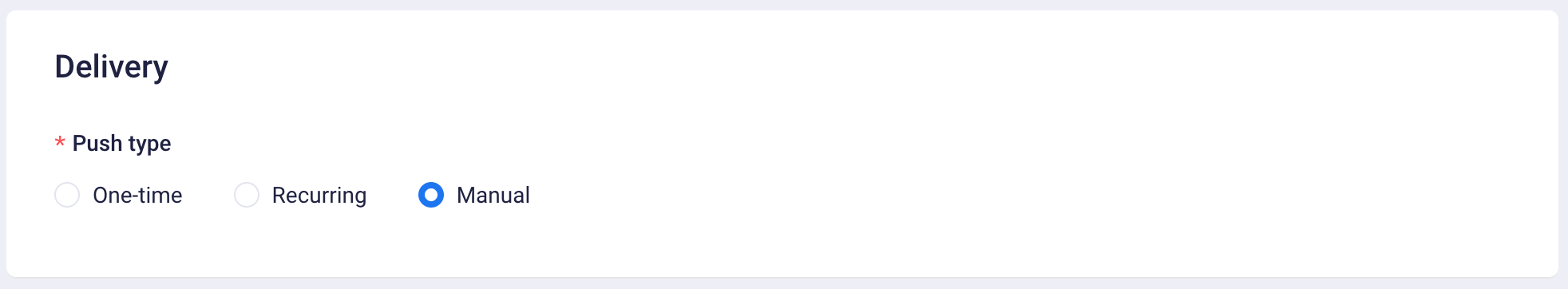 Delivery: A variety of push types, such as One-time, Recurring (daily/weekly/monthly) and manual, are available.