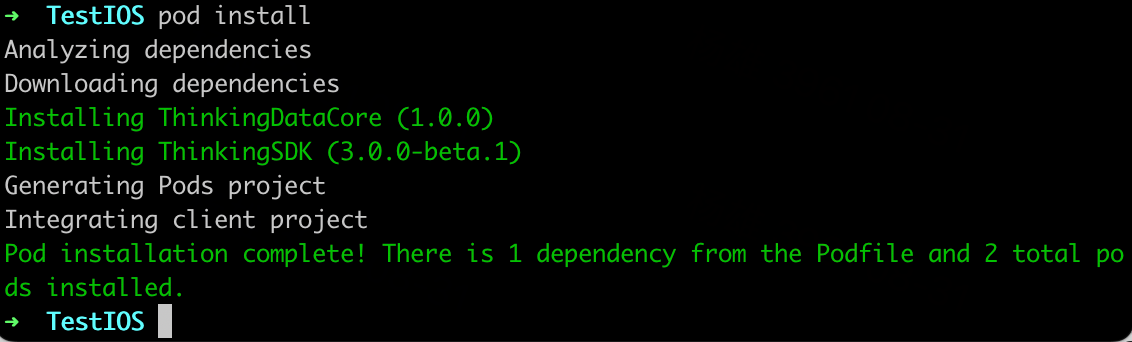 コード実行成功後、.xcworkspaceのファイルが生成されるとiOS SDKがインポート成功です。.xcworkspaceを起動してください。(注意:その際に同時に.xcodeprojのファイルを起動することができません)