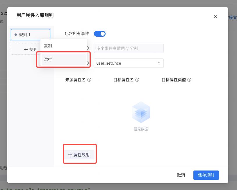 在默认情况下,TE 系统不会将 AppLovin 回传数据写入到用户属性中。如果您希望将一些字段写入用户表,请首先打开规则,使其运行,再通过属性映射功能添加需要写入用户表的字段,来源属性名需填写字段的入库名,可参考 3.1 章节内容: